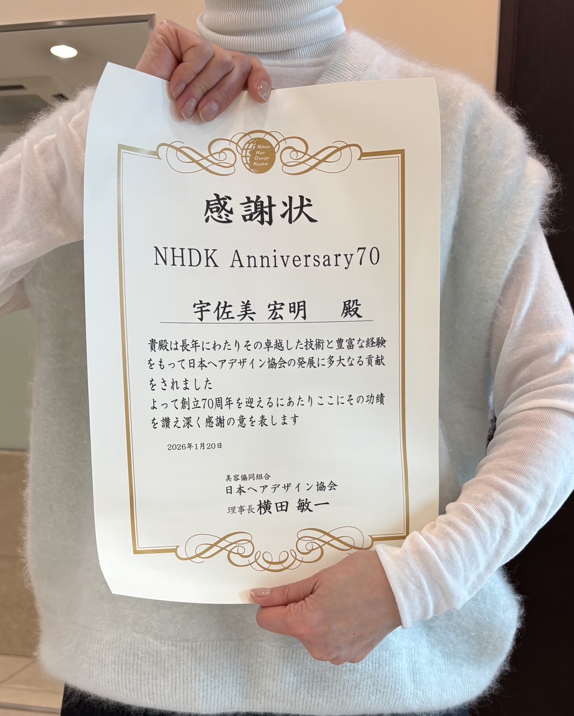 このたびは、美容協会七十周年という記念すべき節目に、功労賞という大変光栄な賞を賜り、誠にありがとうございました。